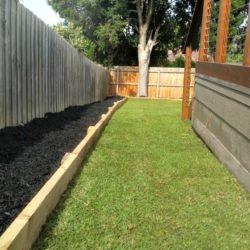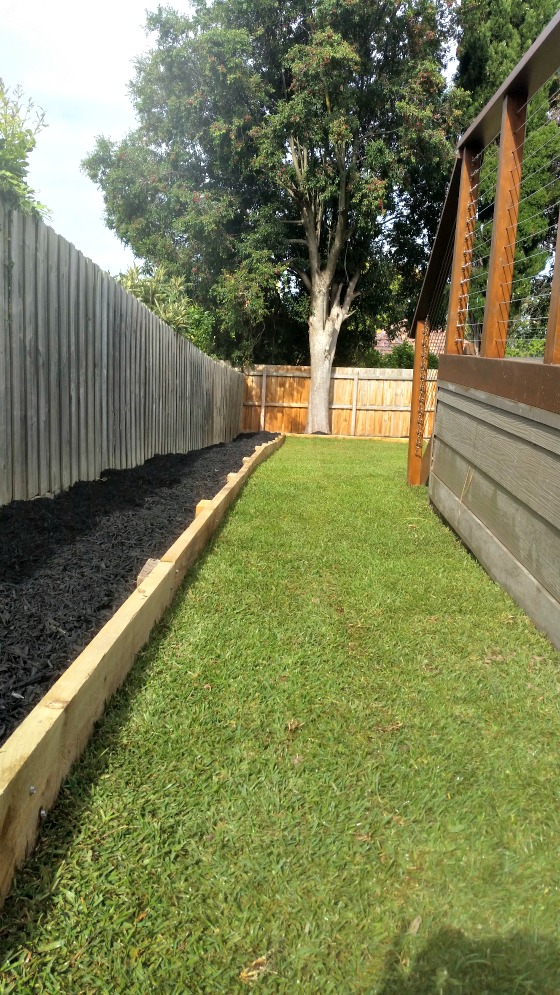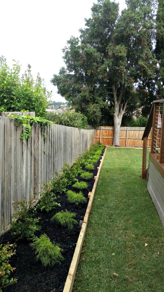 Kings Pride Buffalo instant turf was laid and the gardenbeds planted with a row of Lily Pily Backyard Bliss. These are a fast growing variety with a compact habit which will be grown into a hedge. Acacia Dazzlers were planted along the front of the gardenbeds forming a soft, green border. Black mulch was spread over the gardenbeds to reduce water evaporation from the soil and to reduce weed growth.